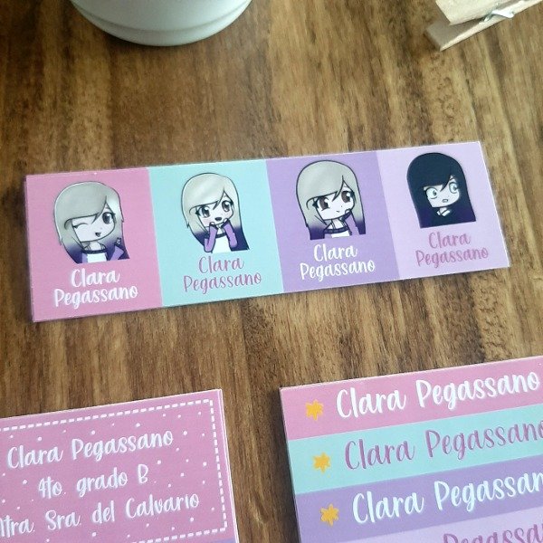 Plancha tamaño A4 de papel adhesivo. Esta opción es ideal para rotular útiles escolares pero sobre todo te las recomiendo para lápices y fibras. Optamos por realizar un tamaño mas amplio, que permita darle la vuelta entera y que no se despegue.